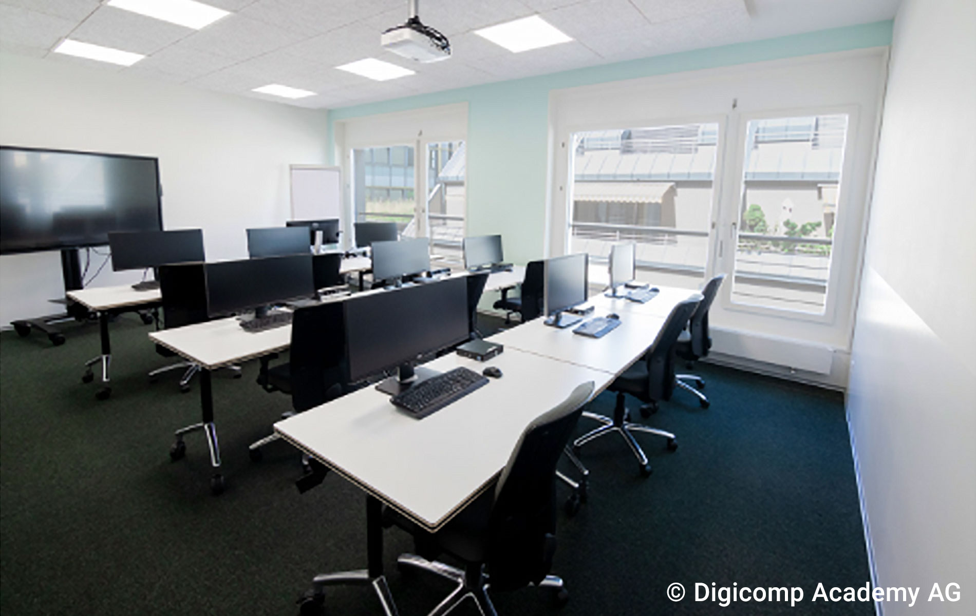 Die von unserem Partner Digicomp angemieteten Schulungsräumlichkeiten sind mit modernen Computern ausgestattet. Jedem Teilnehmenden steht ein eigener Arbeitsplatz zur Verfügung.